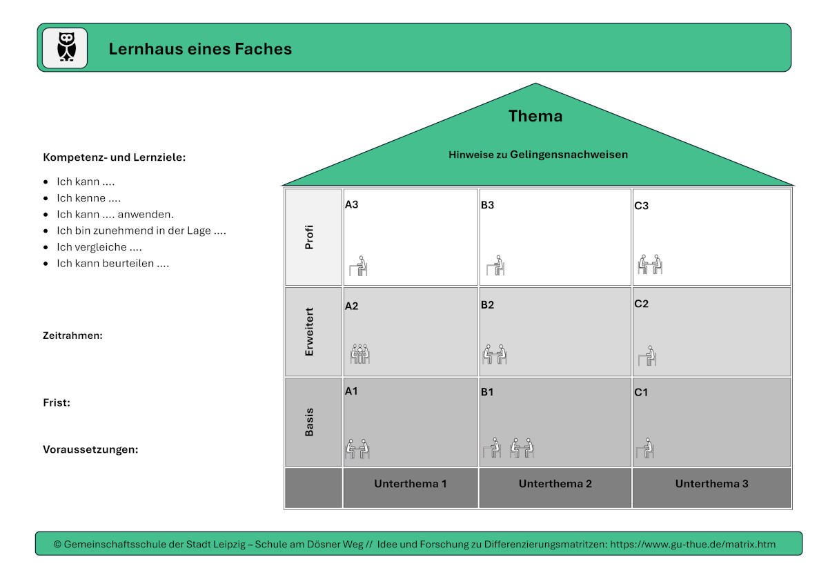 In enger Kooperation mit der Universität Leipzig und als Teil eines bundesweiten Netzwerkes von Deutschen Preisträgerschulen konzipieren wir den „Lernstoff“ visualisiert als Lernhäuser in sogenannten Differenzierungsmatrizen. Dabei beginnen die Lernenden mit dem Basisniveau (dem Erdgeschoss) und hangeln sich von Etage über Etage zu einem Erweitertenniveau bis hin zum Profiniveau vor. Das Dachgeschoss dient der Lernzielorientierung. Der Lernstoff an sich ist digital gestützt konzipiert. Das heißt, das traditionelle Lehrbuch beziehen wir ebenso ein wie digitale Lernformate.
